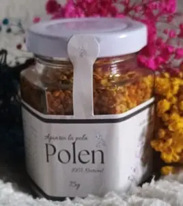 Suplemento natural recolectado por las abejas a partir de las flores. Es reconocido por su alto valor nutricional y sus propiedades energéticas. Se presenta en gránulos multicolores que reflejan la diversidad floral del municipio de Guaduas.
